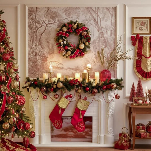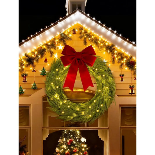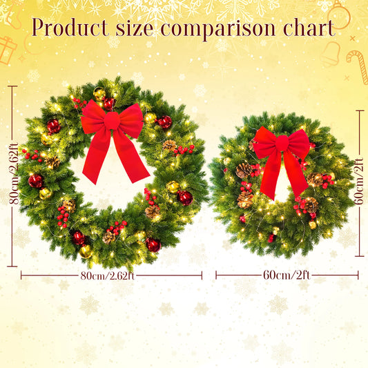 Pre-Lit 24 Inch Christmas Wreath for Front Door, Large Outdoor Holiday Wreath with Red and Gold Lights