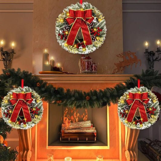 Battery Operated LED Lighted Christmas Wreaths, 12 Inch Pre-Lit Small Xmas Wreaths with Large Bows, Pine Needle Wreaths for Fest
