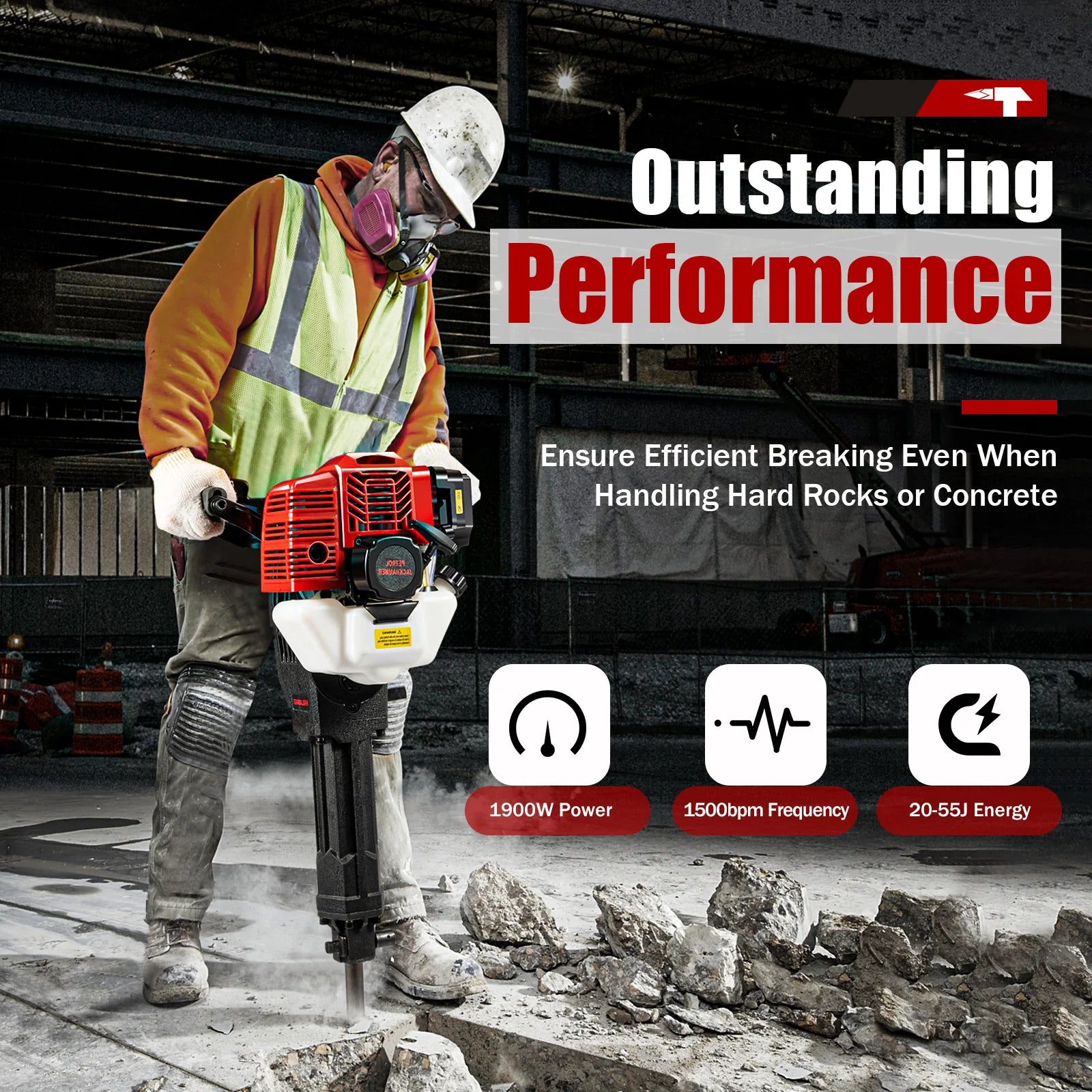 1900W 52CC Gasoline Power Demolition Jack Hammer 1500bpm Impact Frequency Concrete Breaker for Ground Slotting Rock Breaking