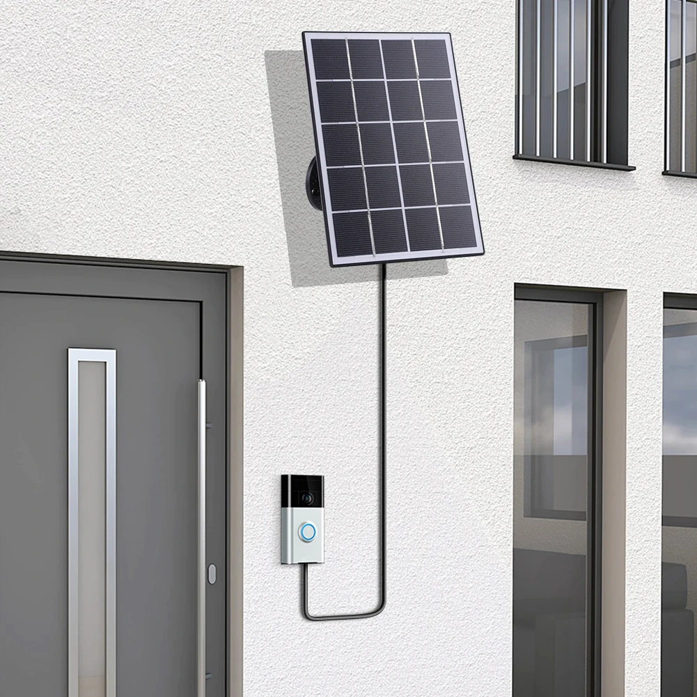 4W Solar Panel for Ring Doorbell IP65 Waterproof Solar Panel Charger 9.8Ft Charging Cable Solar Charging Panel 360° Adjustable Wall Mount Compatible with Ring Video Doorbell 4/3/3 Plus/2 Feature: 1. Design: This solar panel is specifically designed to be compatible with Ring Video Doorbell 4/3/3 Plus/2 and compatible with Ring Battery Doorbell Plus (Video Doorbell). Made from monocrystalline silicon, it features a U-shaped connector port charging cable, making it perfect for powering your doorbell battery by continuously absorbing sunlight and converting it into electrical energy. Note: It is not suitable for doorbells without rechargeable batteries. 2. Efficient Charging: The solar charger can achieve a current of over 5V 1A under sufficient sunlight. With an energy conversion efficiency of up to 20%, it is recommended to have at least 3-4 hours of direct sunlight without obstructions to quickly charge your doorbell battery. The built-in smart IC provides protection against overcharging, overheating, overvoltage, and short circuits, ensuring full protection during charging. 3. Easy Installation: The solar panel charger does not have a built-in battery and uses sunlight to charge the doorbell battery. You can install it in any outdoor location, ensuring the best angle to receive ample sunlight. Simply drill a hole in the wall, install the 360° rotatable wall mount, face the solar panel towards direct sunlight, and connect the 9.8 ft (3m) charging cable with the U-shaped connector to the two ports on the back of the doorbell battery. 4. IP65 Waterproof: The solar panel kit features a surface made of monocrystalline silicon and is IP65 waterproof, rainproof, and snowproof, making it suitable for outdoor use. It eliminates the hassle of frequently removing the doorbell battery for charging. It can withstand harsh weather conditions, is easy to clean, and . The working temperature range is -4°F to 122°F. The charging cable connector comes with a fork-shaped connector for easy connection to the two ports on the back of the video doorbell battery. (Note the waterproof protection of the charger port) 5. Weather-Resistant Durability: This solar charging panel is built to last, with construction that ensures reliable performance in various weather conditions. Its design and easy maintenance make it a convenient solution for keeping your doorbell battery charged without constant removal. Enjoy continuous power supply regardless of the weather, enhancing the longevity and efficiency of your doorbell system.