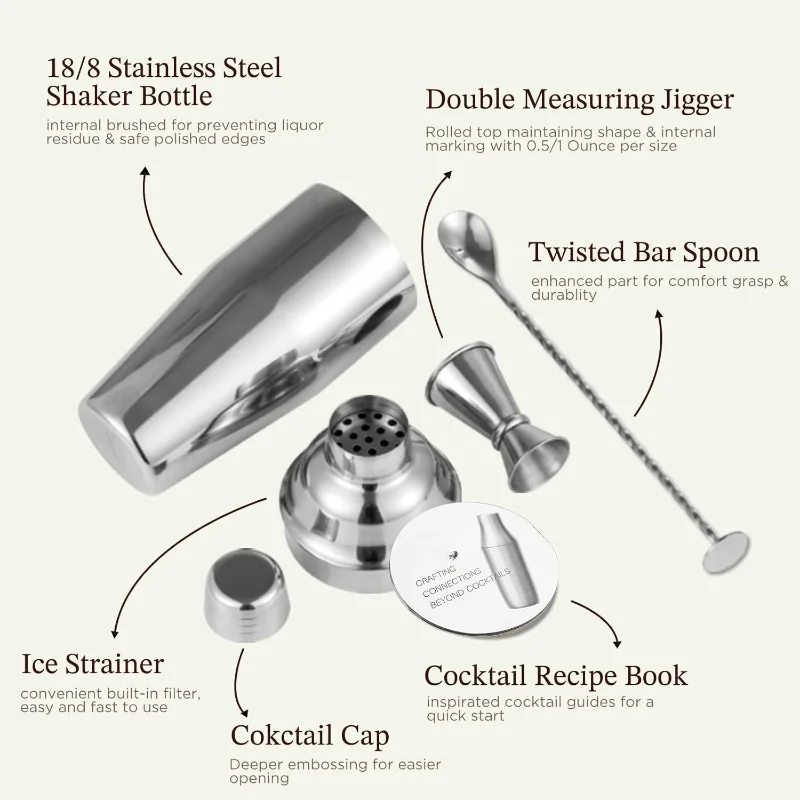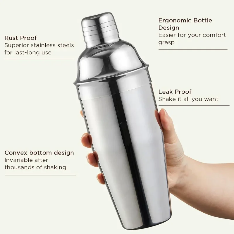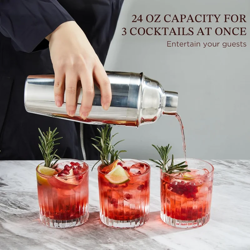 Cocktail Shaker 24oz Drink Shaker with Bartender Strainer, Measuring Jigger, Bar Mixing Spoon, Professional Drink Mixer Silver