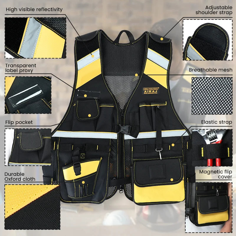 Heavy Duty Tool Vest Reflective Safety Multiple Pockets Oxford Tool Vest Breathable Adjustable Wear-resistant Storage Tool