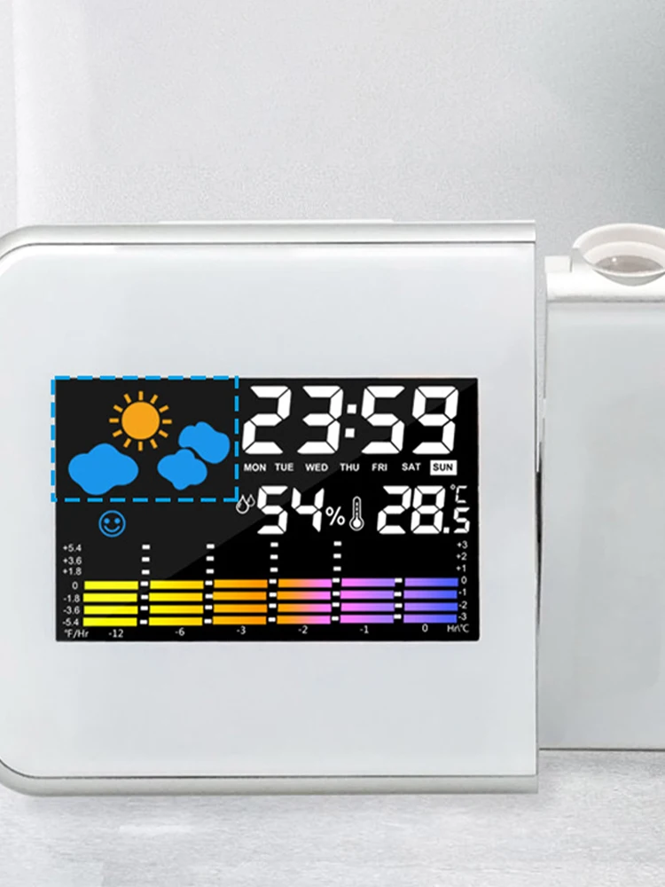 2. Four Weather Conditions: Sunny, Partly Cloudy, Cloudy, Rainy: Stay updated on the weather with this clock's four weather condition projections. Whether it's a sunny day, transitioning from cloudy to sunny, overcast, or rainy, you'll have a visual representation of the current weather conditions.