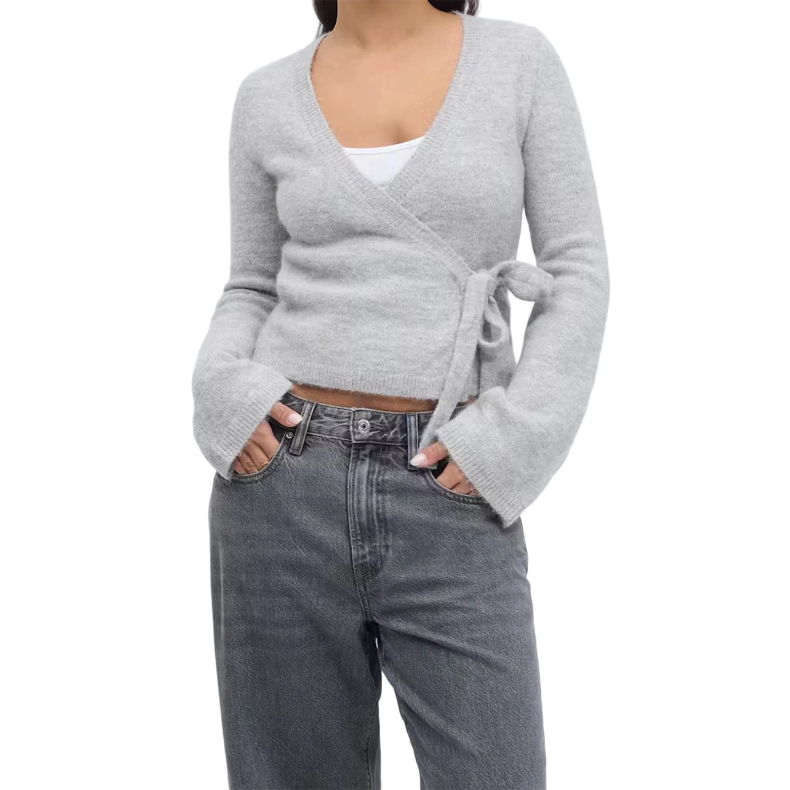 Women s V Neck Tie Front Wrap Cardigan Long Sleeve Crop Knit Sweater Casual Fall Clothes Solid Color Stylish Top